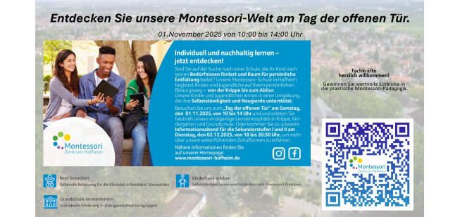 Wir arbeiten durchgehend nach dem pädagogischen Ansatz Maria Montessoris und begreifen Lernen als einen persönlichkeitsbildenden lebenslangen Prozess.