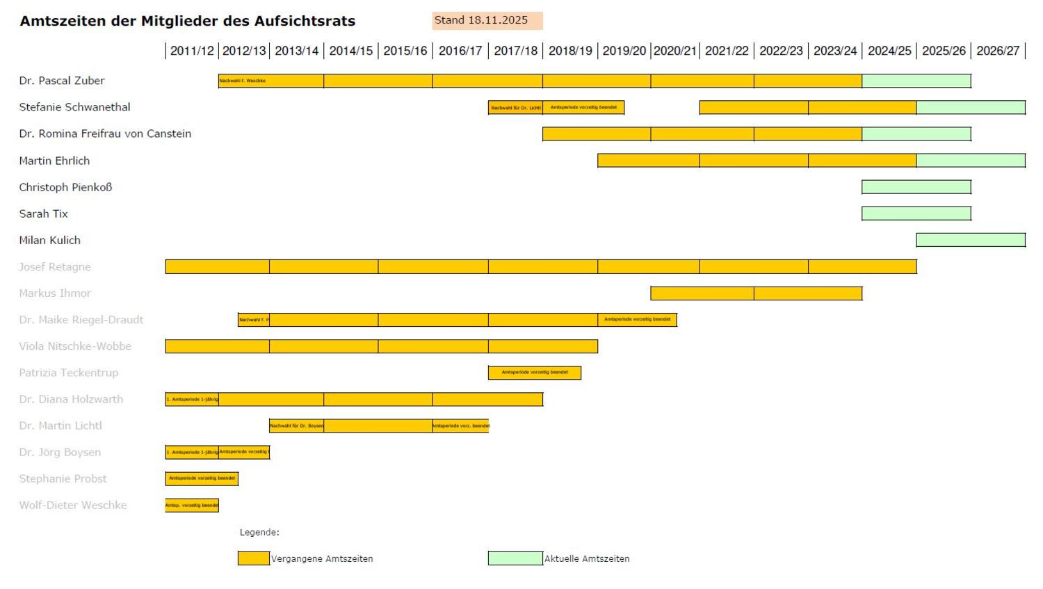 Der Aufsichtsrat wird von der Mitgliederversammlung gewählt. Er besteht in der Regel aus sechs Vereinsmitgliedern. Ausnahmsweise kann die Mitgliederversammlung auf Antrag des Aufsichtsrates für eine Wahlperiode auch sieben Mitglieder wählen. Die Wahl der Mitglieder des Aufsichtsrates erfolgt für die Dauer von zwei Jahren. Die Amtszeiten der Aufsichtsratsmitglieder sind gestaffelt, um eine Kontinuität der Arbeit sicherzustellen. Die Amtszeiten beginnen und enden mit der Mitgliederversammlung, die in der Regel im November stattfindet.